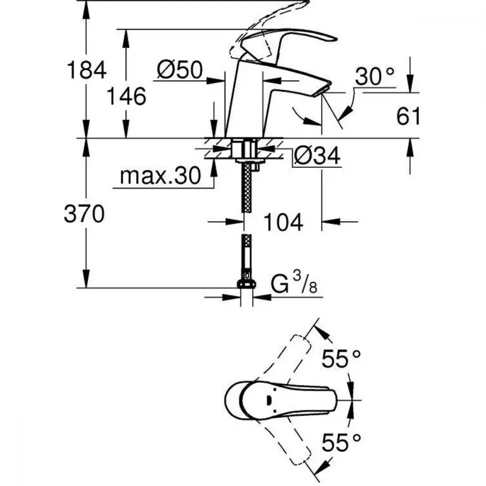 - рукоятка расхода с экономичной кнопкой GROHE EcoButton и индивидуально устанавливаемым стопором
