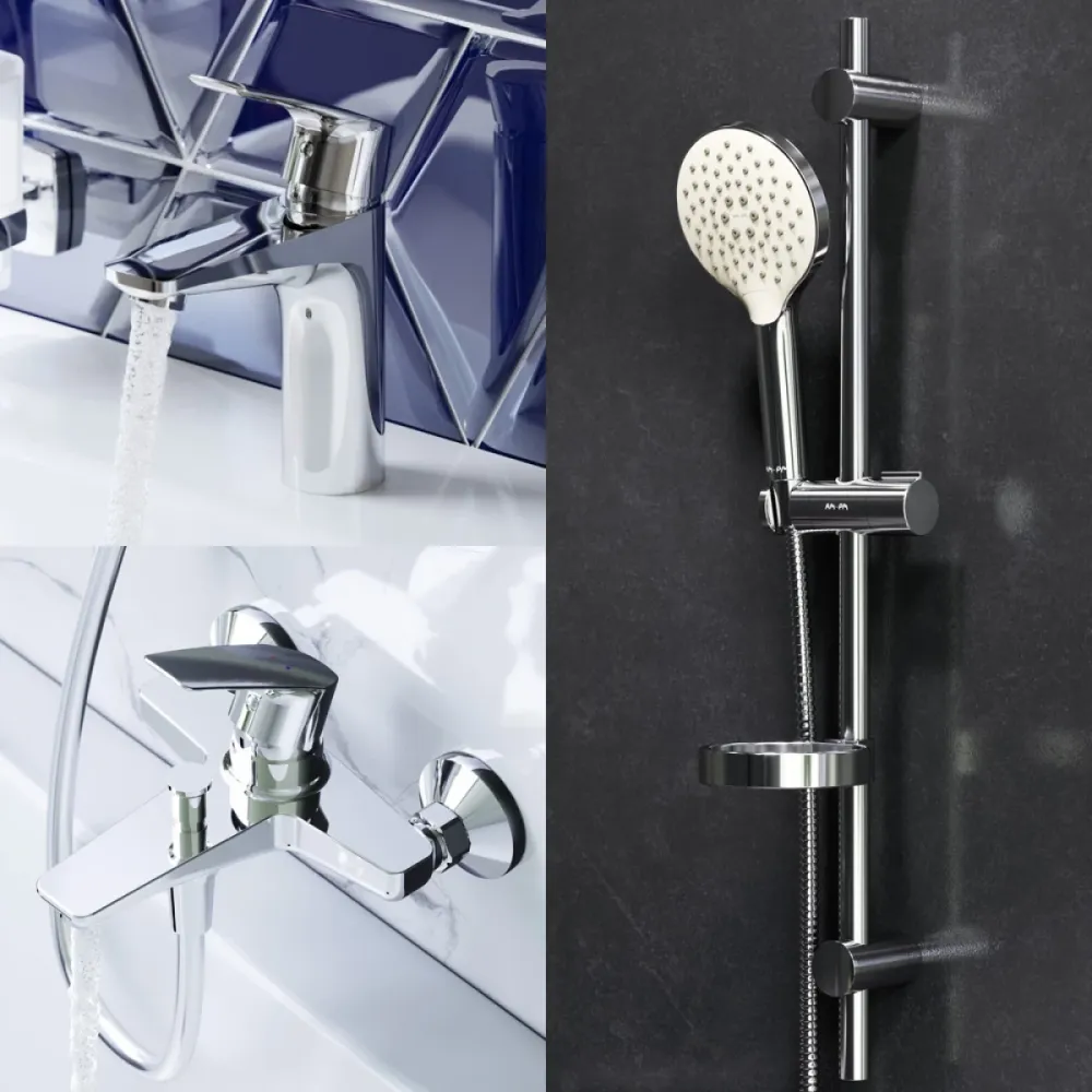 Крепление, Аэратор, Металлическая розетка, Эксцентрики, Душевой шланг, Душевая лейка, Держатель для душевой лейки, Смеситель, Мыльница, Штанга душевая
