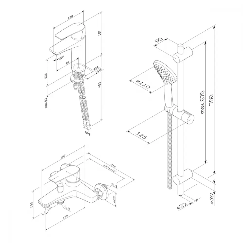 Крепление, Аэратор, Металлическая розетка, Эксцентрики, Душевой шланг, Душевая лейка, Держатель для душевой лейки, Смеситель, Штанга душевая