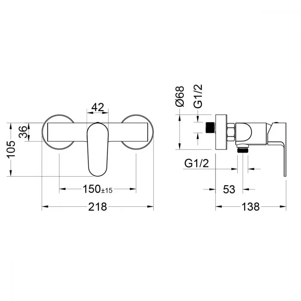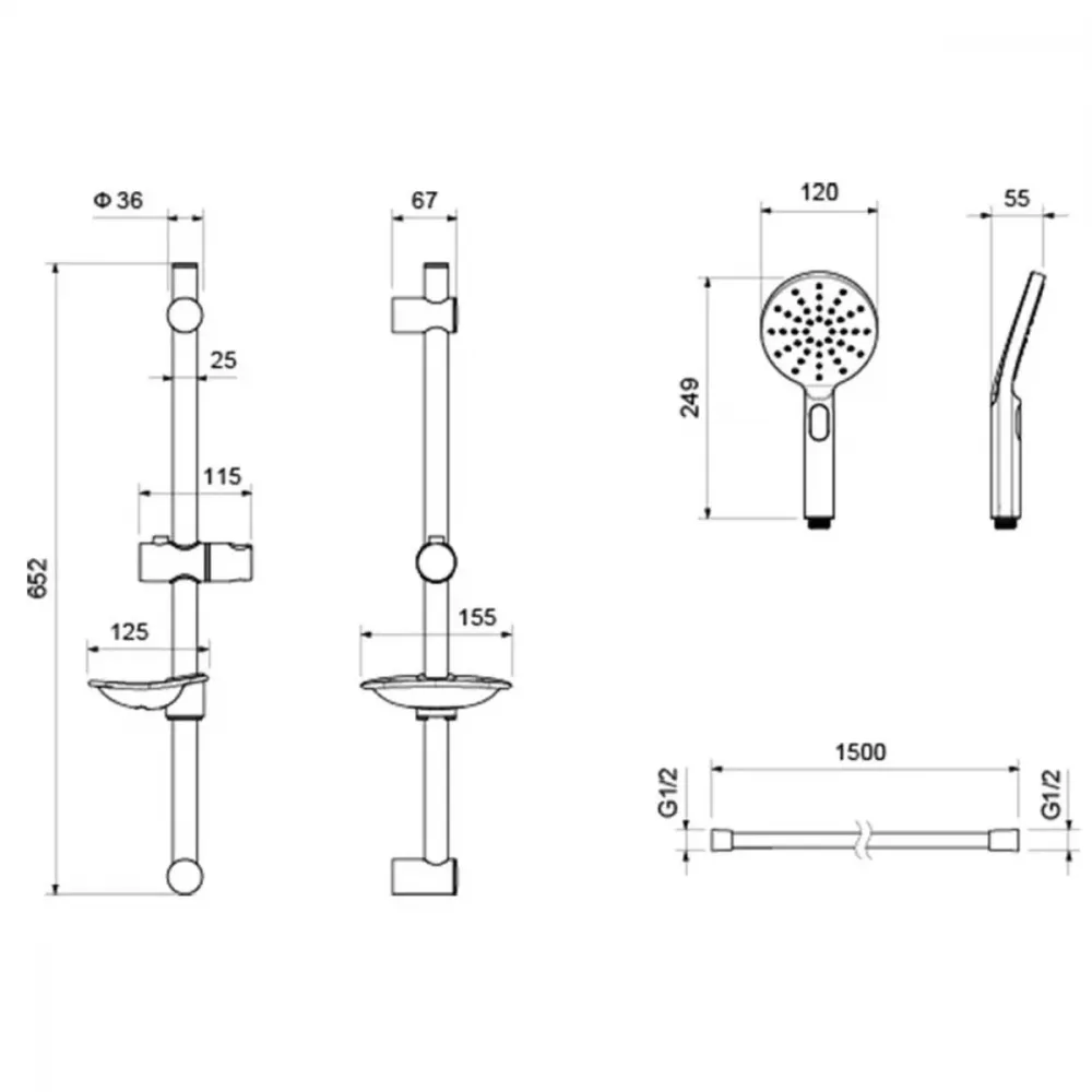 Крепление, Гибкая подводка, Металлическая розетка, Эксцентрики, Душевой шланг, Душевая лейка, Держатель для душевой лейки, Смеситель, Мыльница, Штанга душевая