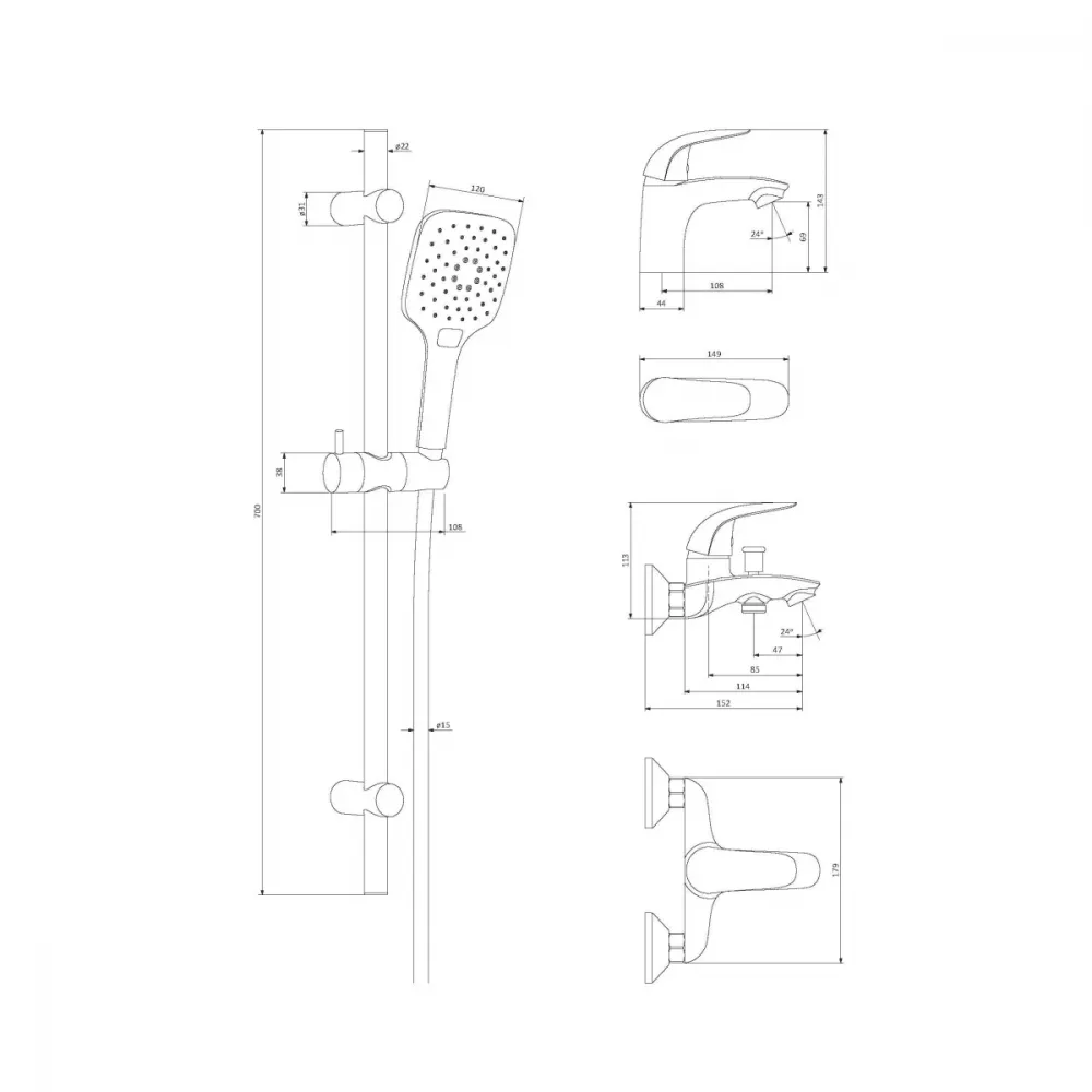 Крепление, Аэратор, Гибкая подводка, Металлическая розетка, Эксцентрики, Душевой шланг, Душевая лейка, Держатель для душевой лейки, Смеситель, Штанга душевая