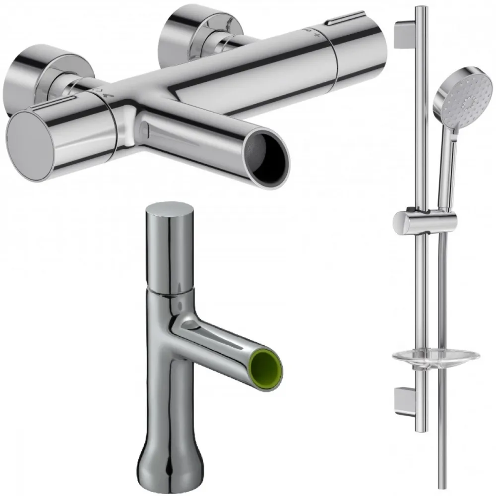 Крепление, Аэратор, Гибкая подводка, Металлическая розетка, Эксцентрики, Душевой шланг, Душевая лейка, Держатель для душевой лейки, Смеситель, Штанга душевая, Термостат