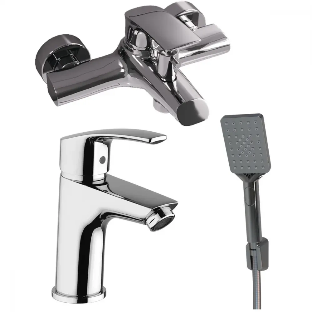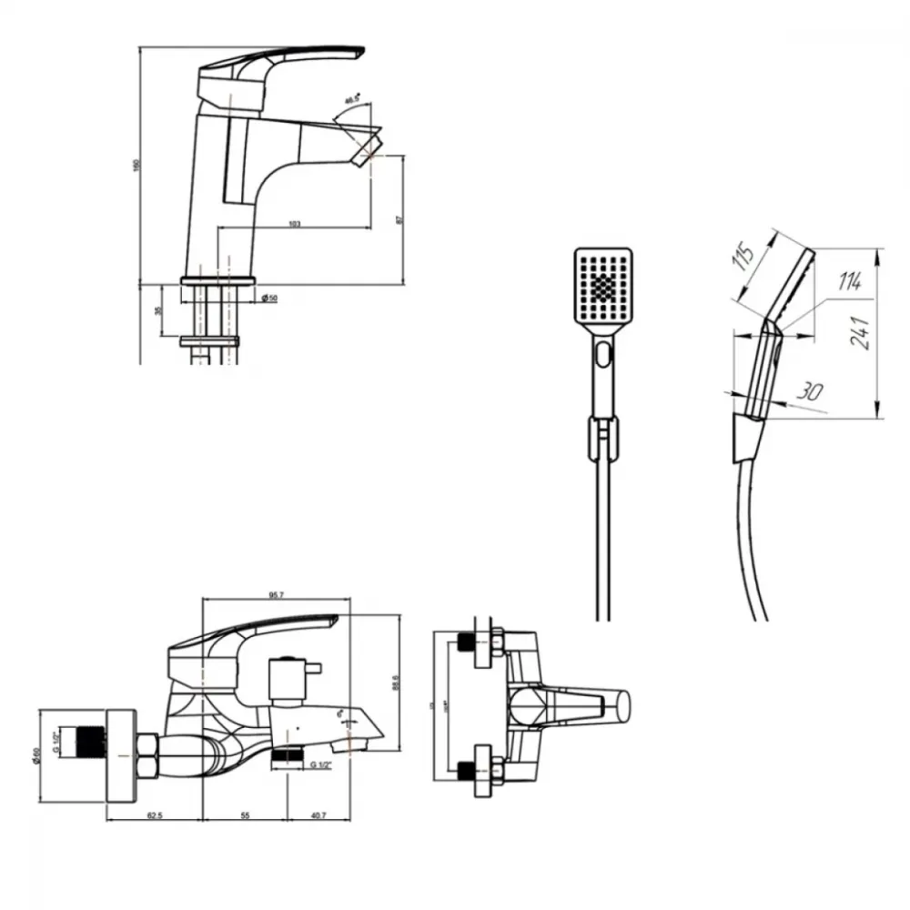 Крепление, Аэратор, Гибкая подводка, Металлическая розетка, Эксцентрики, Душевой шланг, Душевая лейка, Держатель для душевой лейки, Смеситель
